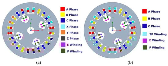 The multi-pole armature windings configuration is shown in Figure 5b. For a fair comparison of characteristics, the multi-pole armature of the proposed machine has the same number of slots 24 as a reference model, where 18 slots are used for three-phase 4P-winding and the remaining 6 slots are used for single-phase 2P-windings.