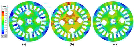 The magnetic flux density distribution comparison is given in Figure 9a–c. The maximum values for both the reference machine, and case 1 and case 2 of the proposed machines are 1.29 T, 1.62 T, 1.37 T, respectively. It is revealed that the flux density distribution in the proposed machine is slightly higher than that of the reference machine due to higher induction. However, the maximum flux density distribution for both machines is under the saturation level.
