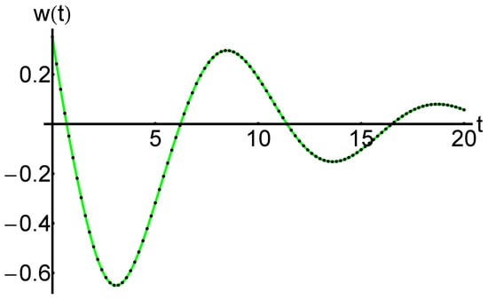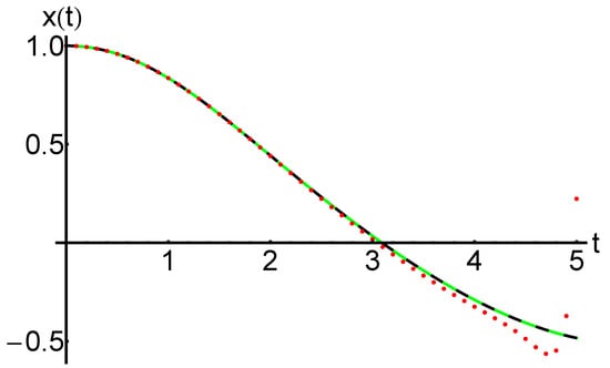 Figure 1, Figure 2 and Figure 3 present the comparisons between the analytical approximate solutions given by OHAM and numerical results provided by Runge–Kutta fourth steps integrator, for initial conditions , , , and for . From these figures it follows that the behavior of the analytical approximate solutions and Runge–Kutta fourth steps integrator’s results are quite the same.