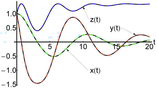 Comparison between the approximate closed-form solutions , , of the Chen system given by Equation (7) and corresponding numerical solution: numerical solution (with lines) and OHAM solution (dashing lines), respectively.