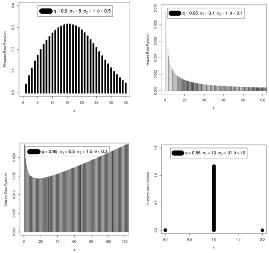 For the standard Weibull baseline model, it is seen that . Then based on (3), the PMF of the discrete generalized Rayleigh Weibull (DGzR-W) model can be expressed as and . Clearly, when , the DGzR-W model reduced to the DGzR-exponential model. The PMF of the DGzR-W model is plotted in Figure 1 for some parameter values. Figure 2 displays some plots of the DGzR-W model’s HRF for selected parameter values. Based on Figure 1, we note that the PMF of the DGzR-W can be “symmetric probability mass function”, “right skewed probability mass function with no peak”, “right probability mass function skewed with one peak” and “left skewed with one peak”. Based on Figure 2, we note that the HRF of the DGzR-W can be “upside down hazard rate function”, “monotonically decreasing hazard rate function“, “decreasing-constant-increasing (U-hazard rate function)”, “monotonically increasing hazard rate function“ and “decreasing-constant” and “constant with one value”.