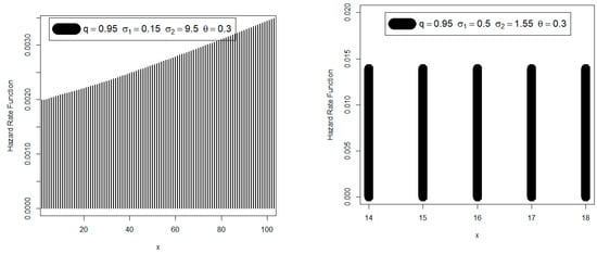 where refers to the generated odd ratio function of any discrete non-negative random variable (DNNRV). The DGzR-G family’s hazard rate function (HRF) is , or