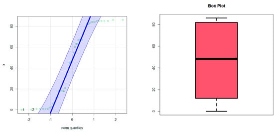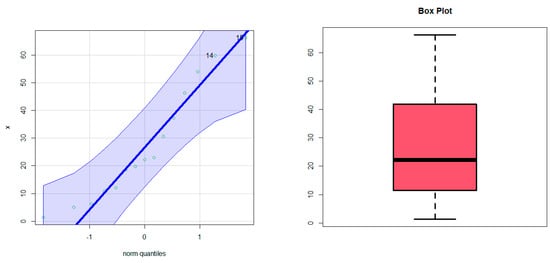 The Q-Q plot (left graph) and the box plot (right graph) for the failure times data (fifteen electrical components’ failure rates).