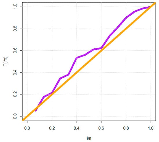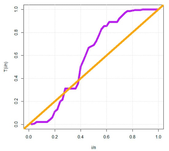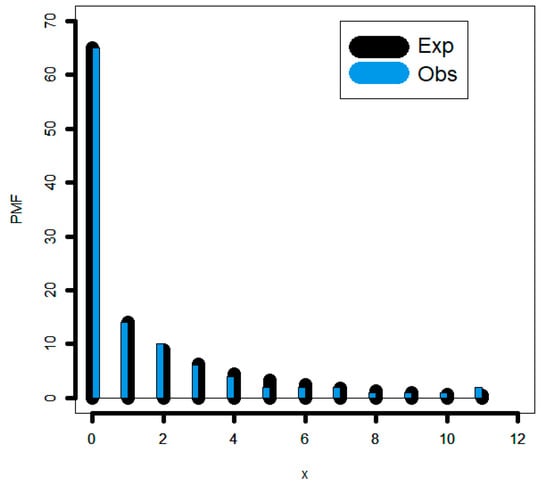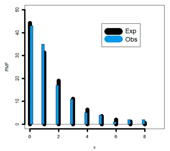 According to Bodhisuwan and Sangpoom [], this data reflects the quantity of parasitic European corn-borer larvae in the field. Bodhisuwan and Sangpoom [] randomly chose 8 hills from 15 replications for their stochastic biological experiment and counted the number of corn borers on each hill. Table 7 gives the estimators under Bayesian and non-Bayesian estimation methods, ks and PV statistics for number of European corn-borer larvae parasites data. Based on Table 7, the MLE method is the best method with ks = 0.6850 and PV = 0.40800, then the Bayesian method with ks = 2.66196 and PV = 0.10277. However, the OLS (ks = 11.1466 and PV = 0.00084 < 0.01) and the WLS (ks = 11.77512 and PV = 0.00060 < 0.01) method does not perform well.