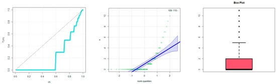 For this zero-inflated real data set, we compare the fits of the D-W, DR, D-IW, DE, D-Lx, D-Li-II, D-Li, and Poisson distributions to those of the proposed DGzR-W distribution in this subsection. A list of the MLEs and their SEs may be found in Table 13. Table 14 displays the GOF data. Figure 7 shows the TTT plot, Q-Q plot, and Box plot vs. the EHRFs for the quantity of kidney cysts. Figure 8 displays the fitted PMFs and EHRF for the number of renal cysts. The DGzR-W offers the finest fits versus all competing models, according to Table 14 with –ℓ = 166.85, AIC = 341.7, CAIC = 342.081 = 0.14815 and PV = 0.70031.