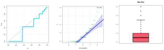 For this application, we compare the fits of the DGzR-W model to those of the DGE-II, D-Lx, DEx, DIR, DR, D-IW, D-Pa, and D-BXII competing models. The MLEs with their SEs and the GOF data are detailed in Table 11 and Table 12, respectively. Figure 5 displays the Q-Q plot and box for the failure times data. The DGzR-W model’s EHRF and TTT plots for the data on the failure rates of fifteen electrical components are shown in Figure 6. The DGzR-W offers the finest fits versus all competing models, according to Table 12 with −ℓ = 63.535, AIC = 135.071, CAIC = 139.071, ks = 0.12238, PV = 0.97820.
