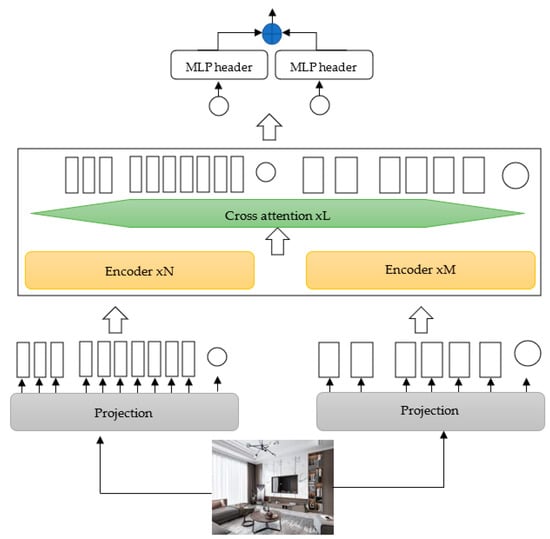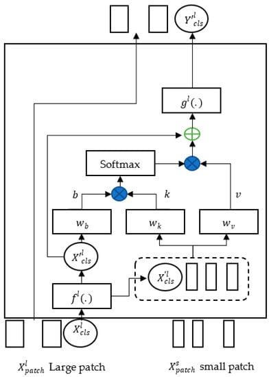 where is the projection function for dimension alignment. After this step, the cross attention is performed between and . The only query is the class token since patch tokens’ information are fused into the class token. The cross-attention fusion can be computed as Equation (6).