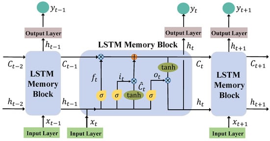 The infrastructure of LSTM is illustrated in Figure 2. The aforementioned gating mechanism includes an input gate, forget gate, and output gate. LSTM uses the historical data x to predict the output sequence , where d is the prediction period. The maintenance and update of information follow several steps below. First, the input gate determines how much new information can be stored in the cell state, while calculating the candidate value that may be added to the cell state.