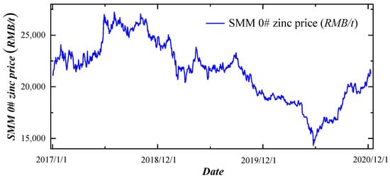 This paper uses the classic commodity zinc as an example to verify the excellent performance of the proposed method. The price of zinc in SMM is collected and set as the target. At the same time, 18 possible factors are collected which may affect the change in the zinc price, including the economic situation, international currency exchange rate, and stock, such as the S&P 500 Index, the price of LME zinc, and so on. For the convenience of expression, relevant abbreviations are shown in Table 1. The price series of SMM zinc is illustrated in Figure 4. Due to the influence of many factors, the price fluctuates frequently and changes widely. Specifically, the time span of zinc price is from 3 January 2017 to 2 December 2020, excluding public holidays, with a total of 953 daily observations. The data from 3 January 2017 to 24 February 2020 (763 observations) is used for model training, meanwhile, the remaining data (190 observations) serves as a testing dataset to verify the ability of the forecasting model.