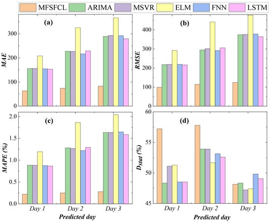 The comparison of different forecasting models for different days. (a–d) are the results for MAE, RMSE, MAPE, and , respectively.
