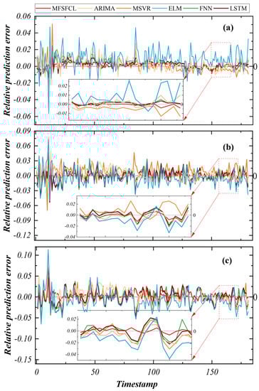 The relative prediction errors of different forecasting models for different days; (a–c) depict the relative prediction errors of day 1, day 2, and day 3, respectively.