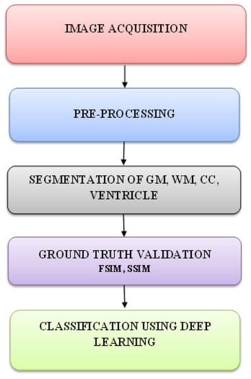 Generally, hospital images are not of good quality due to their homogeneous intensity values of both the object and background region. Since the segmentation of the brain’s inner regions, especially the GM, CC, HC, ventricle, and WM, is a challenging task due to their similar intensity values, there is a need to apply preprocessing for image quality improvements. Initially, the adaptive histogram equalization approach was employed to enhance the contrast and extract distinct regions, and Otsu’s thresholding method was utilized to remove undesired areas, such as the skull, skin, and muscle. Adaptive histogram equalization was used to convert each pixel using a transformation function derived from a neighboring region. Similarly, Otsu’s method produces satisfactory outcomes in removing unwanted regions due to its technique of maximizing the between-class variance for extracting a better optimal solution. This approach aids in the extraction of non-brain and brain tissues with weak boundaries and equal intensities. These processes are helpful in numerous clinical applications to obtain very good accuracy, and they are key resources for brain region segmentation. The methodology of the study is presented in Figure 1.