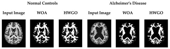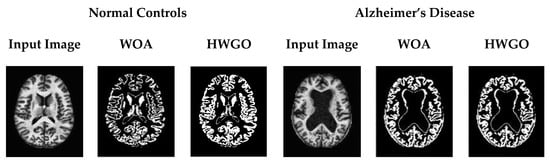 Dementia is a type of memory impairment that affects around 50 million individuals globally today. Alzheimer’s disease (AD) is a degenerative illness characterized by the formation of amyloid proteins in brain cells. An increase in amyloid protein levels induces cell death and impairs signal transmission. AD is an increasing public health problem among developed countries []. It can be characterized by impaired intellectual functioning, which interferes with day-to-day activities or personal relationships. The impairment comprises social behavior, memory loss, thinking, and language problems. Aging is the major factor causing AD, which mainly affects people above the age of 65 years []. CSF-containing ventricle channels are significantly expanded in Alzheimer’s disease patients [,]. The GM, CC, WM, HC, and ventricle are the biomarkers to diagnose AD. Because of the location of the medial temporal lobe, variations in the ventricular shape lead to changes in GM (MTL). Ventricle changes are utilized to calculate the rates of hemispheric atrophy. The quantity of neurofibrillary tangles and the degree of senile plaque deposition in nerve cells are significantly connected to the ventricular volume, which causes GM and WM shrinkage []. Tissue loss usually starts in the gray matter and moves to the white matter, corpus callosum, and hippocampus. A rapid loss of tissue signals the early stages of Alzheimer’s disease. Unmyelinated and myelinated neurons are both included in WM and GM. GM is composed of two components: neural connections and processing. GM is made up of a large number of cells that are situated in WM. WM serves as an information highway by connecting GM with the rest of the body components. The CC is a brain subregion that links the cerebral hemispheres, specifically the left and right hemispheres, and assists in communication between them. Apart from these entire regions, one of the major biomarkers for AD is the HC since it is completely responsible for creating new memories and recovering old ones. The primary function of the HC is to retain information in the long-term memory bank and to advance spatiotemporal communication during sleep. Tissue loss is often greater in the HC area than in the other brain subregions. Changes in the structure of the brain’s subregions, especially the GM, WM, CC, ventricle, and HC, are diagnostic markers for Alzheimer’s disease. However, it has been demonstrated that the HC area is more important than the other regions in diagnosing AD due to its direct link to memories [,,]. As a result, the segmentation of brain SRs is an essential step in distinguishing between normal and AD brains. Currently, the holding technique is a prominent method for image segmentation. To differentiate between normal and Alzheimer’s disease brain tissues, SRs such as the GM, WM, CSF, ventricle, CC, and HC must be segmented. For image segmentation, thresholding approaches have been classified as bi-level and multilevel. Although bi-level thresholding can be applied to normal images, it is computationally exorbitant [,]. Multilevel thresholding, on the other hand, may segment complicated pictures. The optimization approach can then be used to solve the disadvantages of bi-level thresholding strategies. The primary goal of applying optimization techniques is to tackle tough issues in a limited amount of time and with limited resources.
