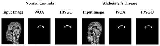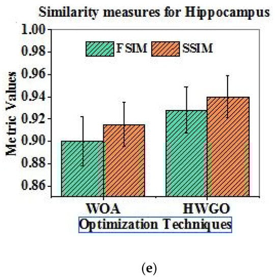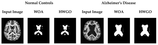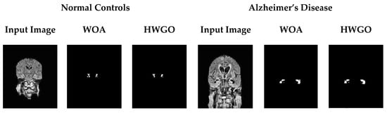 Generally, region extraction from the brain is more sensitive, and it is a more challenging task in identifying/classifying disease progression. However, it is very difficult. It is necessary to identify and extract individual regions to analyze major diseases, such as dementia, brain cancer, AD, epilepsy, and others. As a result, various authors have proposed various methods, such as Fuzzy C means, GWO, BAT, ABC, WDO, and so on, for brain disease progression and have shown better outcomes [,,,,,,,]. According to Table 5, the highest performance was shown by HWGO compared to other methods. According to the findings, the HC provides more signals for diagnosing atrophy in all situations. The atrophy of the HC has a substantial influence on memory. According to the study, the hippocampal region is the most impacted region in the early stages of Alzheimer’s disease compared to other areas since it is located deep inside the brain; it is important for memory assessments, and it is used as a predictive marker for studying the disease. Similarly, the proposed strategy emphasizes the significance of the HC sector.