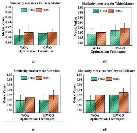 The major parameters of the WOA and HWGO are the number of search agents, number of iterations, and number of threshold values, which are listed in Table 2. The process of fitness function evaluation is repeated until it reaches the best solution. The ending criteria were set to the number of iterations (I) and the number of thresholds (T1). These parameters were experimentally tuned quantitatively and qualitatively to achieve the best solution for segmenting all of the above-mentioned regions. The qualitative measures specify that if the value of T is small, then the SR also includes neighborhood pixels. Similarly, when the value of T is large, the SR regions are blurred. Finally, we obtained the T values for the GM, CC, WM, ventricle, and HC, which were 5, 10, 5, 8, and 13, respectively. Then, the next parameter designated for selecting the optimal value is the number of SAs, and it was fixed at 100 for segmentation. The segmented brain’s inner regions, especially the GM, ventricle, CC, HC, and WM, are presented in Figure 4, Figure 5, Figure 6, Figure 7 and Figure 8 for the different optimization techniques. The segmented output clearly shows the qualitative performance of the WOA and HWGO for various regions. According to Figure 4, Figure 5, Figure 6, Figure 7 and Figure 8, the regions can be segmented more accurately with HWGO than with the WOA due to its quality of searching for the global solution. Based on the qualitative analysis, it is demonstrated that the WOA displays very low performance compared to HWGO due to its naturally poor encircling (bubble-net attack) mechanism during hunting.
