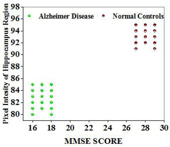 Figure 10 depicts the association between the pixel intensity and MMSE score in the HC area. The normal pixel intensity of the HC region is between 91 and 94, whereas that of Alzheimer’s disease is between 81 and 85. From the results of this validation, the structural anomalies of normal and Alzheimer’s disease patients are assessed using the MMSE score. The graph clearly shows that the MMSE score in both normal and AD patients is highly related to the number of intensity values. As a result, the data collected are therapeutically useful, and they might be utilized to screen Alzheimer’s patients. According to the segmentation and classification results, the HC area is a responsible/key region for identifying an abnormal image of a patient. Hence, the MMSE score was examined for the HC region to differentiate between AD and normal controls, the result of which is shown in Figure 10.