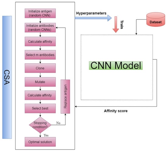 In this paper, we propose a new and efficient neural architecture search (NAS) framework based on CSA for automatically designing high-quality convolutional neural network (CNN) architectures for image classification tasks. CSA is a nature-inspired optimization algorithm that mimics the immune system’s clonal selection process to generate high-affinity antibodies that recognize antigens [,]. In the proposed framework, we use an integer vector representation to encode CNN architectures and hyperparameters, combined with a truncated Gaussian mutation scheme that enables efficient exploration of the search space. Our approach offers a promising and efficient alternative to traditional manual design methods for deep learning architectures, leveraging the power of nature-inspired optimization algorithms to overcome the challenge of finding the optimal CNN architecture. We evaluate our methodology on challenging datasets such as EMNIST, which contains both digits and letters, and achieve cutting-edge performance in terms of accuracy and model complexity.