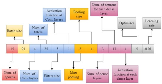 In the proposed CSA–CNN architecture optimization procedure, the first step is to encode the CNN architecture as an antigen. The antigen is a set of hyperparameters that represent a potential solution to the optimization problem. The optimal values of these hyperparameters must be found using the CSA algorithm to create a CNN architecture with the highest test classification accuracy. The antigen is represented by a set of 13 hyperparameters, which are encoded as an integer vector. These hyperparameters form the genes of the antigen. Figure 3 shows an example of a randomly generated antigen, which represents a CNN architecture. The values of the hyperparameters in the antigen are restricted to the ranges defined in Table 1.