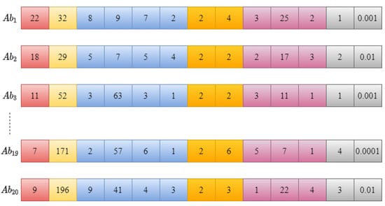 The size of the antibody population is an important factor in the performance of the CSA–CNN optimization procedure. In this work, we set the population size to 20, meaning that 20 different candidate solutions (antibodies) are generated in each iteration of the algorithm. These antibodies are randomly created in response to the antigen initialized in the previous step, as depicted in Figure 4. Each antibody is also encoded as an integer vector, similar to the antigen, and represents a unique CNN architecture.