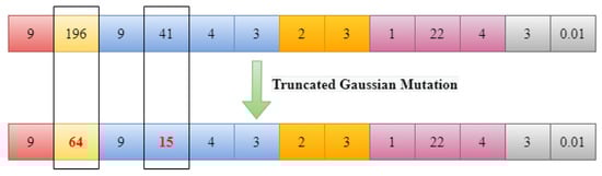 After creating the clones, a mutation operation is performed on each clone. The mutation operation involves randomly selecting genes from the clone and replacing their values with new ones obtained using truncated Gaussian distribution (TGD). TGD is similar to normal distribution but is truncated at a defined range. The range for TGD is determined based on the ranges of the hyperparameters in the antigen. The mutation process is controlled by a mutation rate, which is inversely proportional to the affinity of the antibody. The mutation rate determines the probability of individual component mutation for a given candidate solution, and it is calculated as the exponential of negative product of the mutation rate and the candidate’s affinity value, that is, . Here, f represents the candidate’s normalized fitness value, and  is the user-defined mutation rate hyperparameter. The lower the candidate’s affinity value is, the higher the probability of mutation will be. An illustration of TGD mutation for the antibody  is shown in Figure 5.