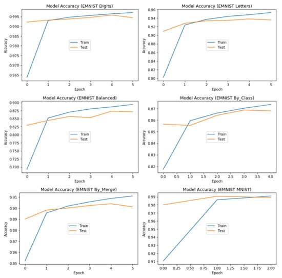 The proposed CSA algorithm successfully discovered an optimal CNN architecture for the EMNIST Digits dataset, achieving a classification accuracy of 99.74% on the test set. Table 3 presents the hyperparameters and their corresponding optimal values of the discovered architecture. We further evaluated the robustness of the optimized architecture by testing it on the other splits of the EMNIST dataset. As each dataset has a different number of classes, we adjusted the softmax layer to have the same number of neurons as the number of classes in each dataset. Figure 6 and Figure 7 provide a plot of accuracy and loss, respectively, on the training and test sets for each of the six EMNIST datasets. The figures demonstrate the performance of the proposed CNN models on the six datasets and provide insights into how the models generalize on unseen data. We implemented the early stopping method to stop the training of the CNN models as soon as their performance stopped improving on a specific dataset in the validation set. This strategy saved time, effort, and computational resources, especially when some datasets (as observed for EMNIST MNIST and EMNIST By_Class) achieved their best performance in less than six epochs. The results show that the proposed CNN models achieved high accuracy and low loss on most of the datasets, and the early stopping method was effective in preventing overfitting. These results demonstrate the potential of the proposed CSA algorithm in discovering optimal CNN architectures that can generalize well on a variety of datasets.