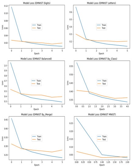 Table 4 provides a comprehensive summary of the performance of each dataset’s tuned architecture in terms of train/test accuracy and train/test loss, as well as the total number of trainable parameters in the model. The table reveals that the CNN architecture of the By_Class dataset has more parameters than the other architectures, primarily because it contains 64 neurons in the last layer, which corresponds to the number of classes in the By_Class dataset. It is worth noting that the tuned architecture’s performance varies across the different datasets. The EMNIST Digits dataset has the highest accuracy for both the train and test sets, with a value of 99.82% and 99.74%, respectively, while the EMNIST Balanced dataset has the lowest accuracy with a train and test accuracy of 89.95% and 88.12%, respectively. In terms of the number of trainable parameters, the architectures for all the datasets have a similar number of parameters, ranging from 241,299 to 242,339.