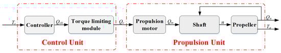 In an MEP system, the torque control loop of a closed-loop propulsion motor can be assumed to be a first-order dynamic model, such as Equation (1). The torque balance equation of the shaft is shown in Equation (2). Equation (3) describes the dynamic characteristics of the propeller. Equation (4) is the further analysis of Equation (3). Equation (5) is the mathematical description of the torque-limiting module.