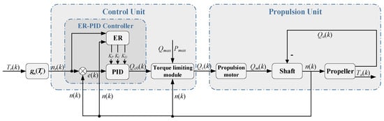 Figure 3 indicates the structure of the shaft speed control model based on the adaptive ER-PID controller. In this study, the design of the ER-PID controller was the core of this work. After that, nr acts on the ER-PID controller to generate the commanded torque Qc0, and then the commanded motor torque Qc can be obtained via the torque-limiting module. Finally, Ta and Qa were generated through the propulsion unit, and the motor torque Qm acts on the shaft so that the shaft speed n can always track the shaft speed reference nr. The process of the ER-PID controller is shown in Figure 4.