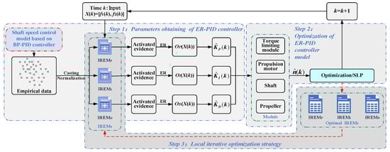 Step 1 (obtain the parameters of the ER-PID controller): First, a shaft speed control model based on the BP-PID controller is constructed to generate the empirical data set, and IREMs (IREMP, IREMI, and IREMD for KP, KI, and KD, respectively) are generated. Then, for the specific input sample X(k) = [f1(k), f2(k)] = [nr(k), n(k − 1)], the activated evidence can be acquired after being substituted into the IREMP, IREMI, and IREMD. Furthermore, the estimated values of the shaft speed () can be obtained via the ER rule. The reasoning process is detailed in Section 3.2.