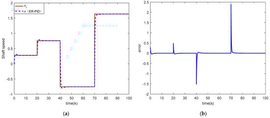 Tracking results of the ER-PID controller. (a) Tracking results that n(k) tracks nr(k). (b) Tracking errors that n(k) tracks nr(k).