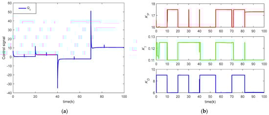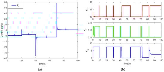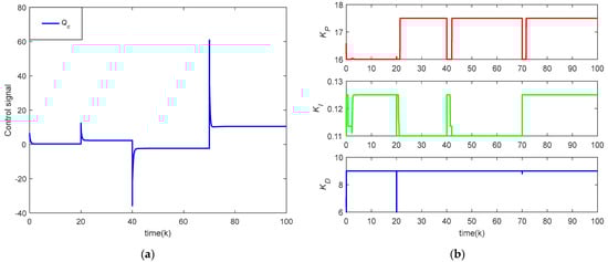Changes of the control signal and controller parameters in single-point perturbation situations. (a) Changes of the commanded motor torque Qc. (b) Changes of KP, KI, and KD.