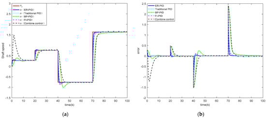 To illustrate the effectiveness of the shaft speed method proposed in this study, the shaft speed control method based on the ER-PID controller was further compared with the control performance of the shaft speed control model based on a traditional PID controller [11], BP-PID controller [15], FI-PID controller [14], and combined control [32]. Furthermore, two simulation experiments of the controller accuracy and random perturbation were implemented.