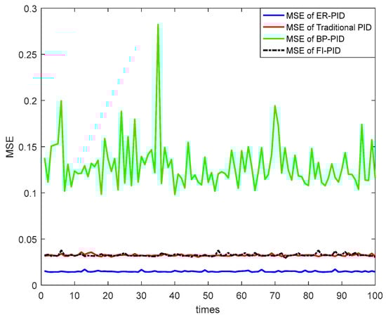 We performed 100 such experiments, where the values of A and w are randomly generated. Table 15 and Figure 14 show the mean value of the tracking MSE and the tracking MSE for the five methods in 100 experiments. It can be seen from Figure 10 that the tracking MSEs of the ER-PID method, traditional-PID method, and FI-PID method were relatively stable in the 100 random perturbation experiments, but the MSE of the BP-PID method had large fluctuations and poor stability.