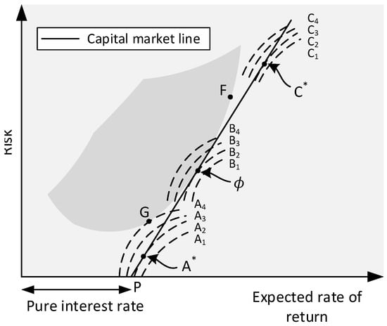 In this graph, the dashed-line boundaries indicate the indifference curves of various investors. An investor with preferences indicated by indifference curves to tries to divide his funds into two parts, one part devoted to providing lending at the net interest rate and the other part devoted to making investment in the portfolio of assets indicated by point , which would allow him to stand in position . An investor with preferences indicated by curves to tries to invest all of his funds in the portfolio of assets indicated by . Finally, an investor with indifference curves to not only invests all of his own funds, but also borrows additional funds to invest in to arrive at the preferred position ().