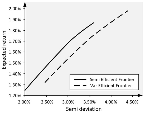 Boasson et al. [64] obtained the diagram shown in Figure 2, indicating two efficient frontiers where the semi-variance efficient frontier moves to the left-hand side of the variance efficient frontier. They reported that the efficient frontier based on the mean semi-variance framework has a higher risk-return trade-off than that based on the mean-variance framework. They also stated that the final difference between the two efficient frontiers might be much more pronounced if the optimization is performed with a greater number of assets rather than a limited number (seven) of exchange-traded index funds (ETF).