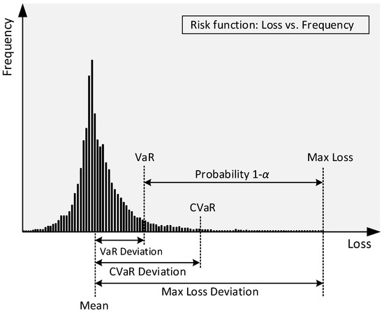 Sarykalin et al. [74] presented the diagram shown in Figure 3 to help understand the concepts of VaR, VaR deviation, CVaR, CVaR deviation, max loss, and max loss deviation.