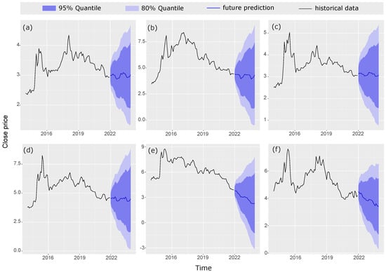 Engle [14] introduced the auto-regressive conditional heteroscedasticity (ARCH) to address the issue. Unlike conventional methods, the ARCH model rejects linear risk–return relationships [15]. By using changing variance, this approach constructs a function which is related to past volatility that accounts for financial data with “sharp peaks” and “fat tails” [16]. Researchers discovered that ARCH needed a large order of q to effectively predict conditional heteroscedasticity [17]. Accordingly, Bollerslev [18] proposed the generalized auto-regressive conditional heteroskedasticity (GARCH), which incorporates the lag phase into the variance. The GARCH model is an efficient way to capture economic data volatility. In recent years, the application of the GARCH model has expanded in the financial sector due to its performance in detecting frequent fluctuations in financial data volatility [19]. Nelson [20] developed a group of diffusion approximations on the basis of the exponential ARCH model.