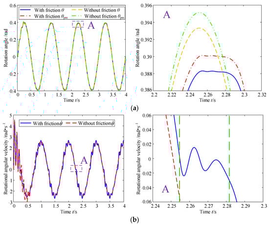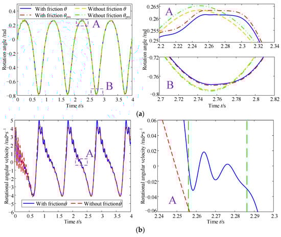 Effect of friction on the dynamic performance of position motor systems at variable stiffness: (a) rotation angle and (b) rotational angular velocity.