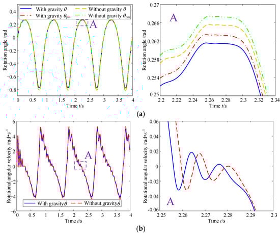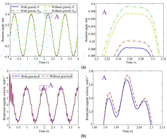 Effect of gravity on the dynamic performance of position motor systems at variable stiffness: (a) rotation angle and (b) rotational angular velocity.