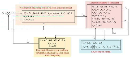 In summary, the proposed sliding mode control strategy based on a nonlinear disturbance observer and associated dynamics model consists of two main components: feedforward control on the motor side and sliding mode control on the load side are mainly used to ensure the stability of the closed-loop system, while the exponentially convergent nonlinear disturbance observer based on linear matrix inequality is mainly used to observe the system’s disturbance and introduce compensation in the control to achieve complete control of the system disturbance. The details are shown in Figure 6.