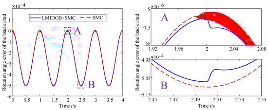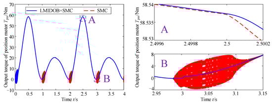 In order to verify the effectiveness of the sliding mode control strategy based on the nonlinear disturbance observer and dynamics model (LMIDOB+SMC), the variable stiffness actuator system is numerically simulated and compared with the position tracking performance analysis of the nonlinear sliding mode control strategy based on the dynamics model (SMC). In the analytic process, since the rotational inertia J of the default load is a constant value, and according to has an upper bound ξ, then ξ = 0.5 can be taken; take Ω = 0.1, and then according to Equation (10), it can be solved for , so take X= 3.9. The initial state of the controlled object then is: initial rotation angle of the load θ0