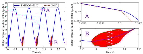As can be seen in Figure 7, compared with the nonlinear sliding mode control strategy based on the dynamics model, the sliding mode control strategy based on the nonlinear disturbance observer and the dynamics model not only substantially improves the buffeting vibration of the position motor system, but also reduces the rotation angle error e1 of the load. Because the disturbance observer compensates well for the disturbance torque of the position motor system, this can also be seen in Figure 8. In addition, it is also seen from Figure 8 that, although the disturbance observer has eliminated the buffeting vibration of the position motor system as much as possible, when the position motor system is in the start-up phase, the torque composition of the system is complicated, and the disturbance observer cannot identify and compensate it quickly enough, so there is still a short period of buffeting vibration in the start-up phase, but it can shortly be eliminated. However, in general, the sliding mode control strategy based on the nonlinear disturbance observer and the dynamics model improves the buffeting vibration phenomenon of the position motor system at a constant stiffness condition, which is beneficial to the improvement of the static index of the system and the reduction of the mechanical wear and energy consumption of the system.
