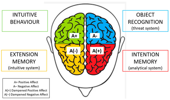 Negative affect is associated with failure or punishment and manifests itself in feelings of danger, sadness, anger or anxiety. Negative affect might be upregulated, A−, when basic needs such as food, security, sleep, etc., are not satisfied. This activates the OR so that the underlying causes can be identified [30]. In contrast, downregulated negative affect, A(−), might be the result of overcoming a problem or restoring a need that was not satisfied previously and is, therefore, accompanied by a sense of assurance. In order to integrate this experience of overcoming a problem into the biographic memory, the EM is activated [31].