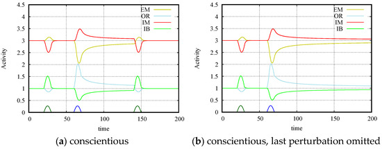 We first show how the four cognitive systems respond to affect perturbations for a specific parameter set, namely, the conscientious personality (see Table 1). Similar results have already been presented in Bröcker [36], but they are reproduced here to demonstrate how affect perturbations influence the dynamics of OR, IB, IM and EM depending on the affect sensitivities , , and .
