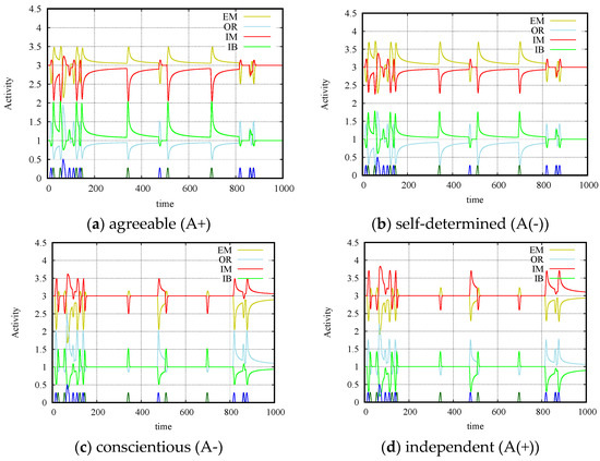 Activities of the cognitive macrosystems EM, OR, IM and IB were calculated according to Equation (10) for (a) agreeable, (b) self-determined, (c) conscientious and (d) independent personality style. Activation levels were obtained from 100 simulations for 1000 time units, and for each simulation, the activities of EM, OR, IM and IB were calculated according to Equation (10). For each personality style, dominant macrosystems can be identified—IB for agreeable and OR for conscientious. EM and IB are most strongly activated for self-determined individuals, whereas IM and OR are the dominant systems for independent persons.
