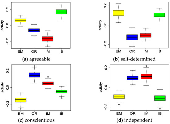 More importantly, we can now answer the question of which cognitive systems are primarily activated for each personality style by identifying systems with a large positive average activation . Figure 6a,c shows that for the agreeable personality, the IB is the dominant system, whereas for the conscientious style, it is the OR, as expected. In Figure 6b, for the self-determined personality style, EM has the highest average activation as predicted by PSI theory, but there is a strong overlap with the box plot for IB. Similarly, in Figure 6d, for the independent personality, IM has the highest average activation, but OR nearly reaches the same level. Thus, instead of having one dominant system, EM or IM, respectively, as predicted by PSI theory, we find that for the self-determined and the independent personality styles, two cognitive systems “rule together”.
