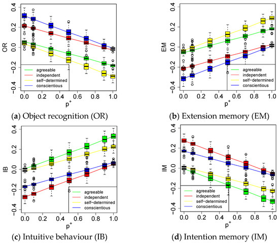 Again, returning to Figure 7, some interesting observations can be made about the dependency of the cognitive systems on the probability of positive affect perturbations . Let us first consider the agreeable and the self-determined personality styles. For , the average activation is very close to zero for all cognitive systems. because these systems would require positive affect, but for , no perturbation with positive affect ever occurs. Additionally, because neither agreeable nor self-determined personalities are particularly sensitive to negative affect, or even downregulate it. For increasing , the average activations of all cognitive systems for both personality styles diverge. Due to the steeper slope for and , self-determined personalities more strongly deactivate the OR and more strongly activate the EM than agreeable personalities. Similar observations can be made for the conscientious and the independent personality styles if we start at and observe how the average activations change for decreasing