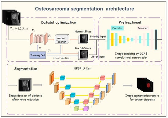 Osteosarcoma is a malignant neoplastic disease located in bone tissue. During MRI detection of osteosarcoma, patients generate a lot of complex image data. The manual screening of images and tumor diagnosis by doctors alone can be time and energy-consuming, and the tremendous workload can lead to an increased rate of misdiagnosis. Additionally, in developing countries, medical resources are tighter, and the doctor–patient ratio is severely imbalanced, making it difficult for patients to receive effective services. Moreover, the long and costly diagnostic cycle of osteosarcoma requires many families to bear high costs. AI-based image processing technology can automatically screen medical images to achieve the diagnosis of patients. The diagnostic results provide an auxiliary basis for doctors, thus improving their efficiency and reducing the cost of diagnosing. In this study, an osteosarcoma-assisted medical system based on NFSR-U-Net is proposed to assist doctors in classifying. Figure 1 shows the architecture of it.