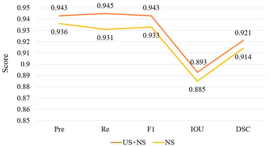 For the purposes of evaluating the segmentation effect of the model, we chose the widely used evaluation metrics of accuracy (Acc), precision (Pre), recall (Re), F1-score (F1), intersection of union (IOU), and dice similarity coefficient (DSC) for model performance evaluation.