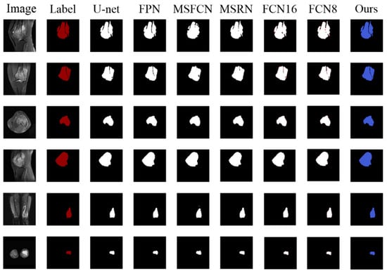 For the sake of evaluating the performance and complexity of the NFSR-U-Net, several MRI image segmentation models were selected for analysis and these models were compared with the NFSR-U-Net for the segmentation effect of osteosarcoma MRI images. These segmentation models consist of U-Net [48], FCN [59], FPN [60], PSPNet [61], MSRN [62], MSFCN [32], and AIMSost [63].